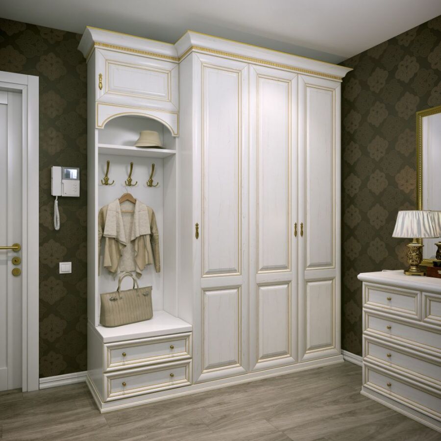Garderobekast in de gang met een zachte zitting en een geprefabriceerde wand